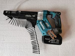 Brushless-Antrieb für kraftvolles und schnelles verschrauben von Trockenbauschrauben mit Gurtmagazin. Das Gerät ist sehr leicht, damit auch über Kopf müheloses Arbeiten möglich ist.